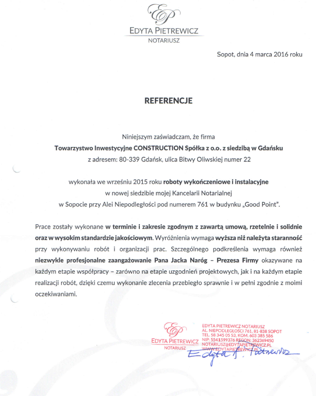 The works were completed on time and in the scope consistent with the concluded contract, reliably and soundly and to a high quality standard. Higher than due diligence in the completion of works and the organisation of the work requires a distinction. The extremely professional commitment of Mr. Jacek Naróg-the President of the Company, shown at every stage of cooperation - both at the stage of design arrangements and at every stage of the works, also requires particular emphasis, thanks to which the completion of the order was carried out efficiently and fully in accordance with my expectations.