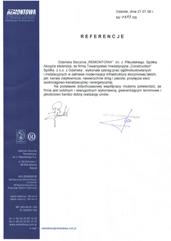 Gdańsk Shipyard "Remontowa" named after J. Piłsudskiego Spółka Akcyjna states that Towarzystwo Inwestycyjne "Construction" Spółka z o. o. from Gdańsk carried out a number of general construction and installation works in the field of modernization of shipyard infrastructure, such as: heating ducts, road surfaces and squares, connections to the water supply and sewage system and energy network.