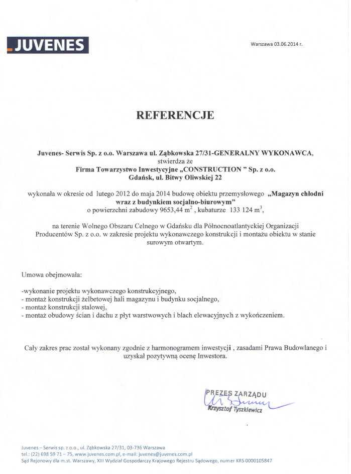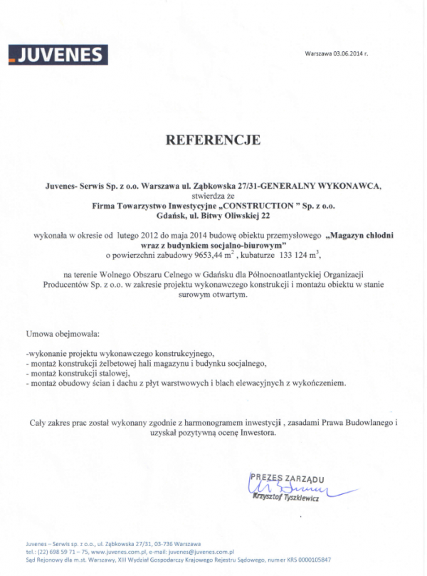 completed the construction of an industrial facility "Cold store warehouse with a social and office building" in the period from February 2012 to August 2014, with a building area of 9653.44 m2, volume of 133 124 m3, in the Free Customs Zone in Gdańsk for Północnoatlantyckiej Organizacji Producentów Sp. z o. o. in the scope of the detailed design of the structure and assembly of the facility in an open shell.