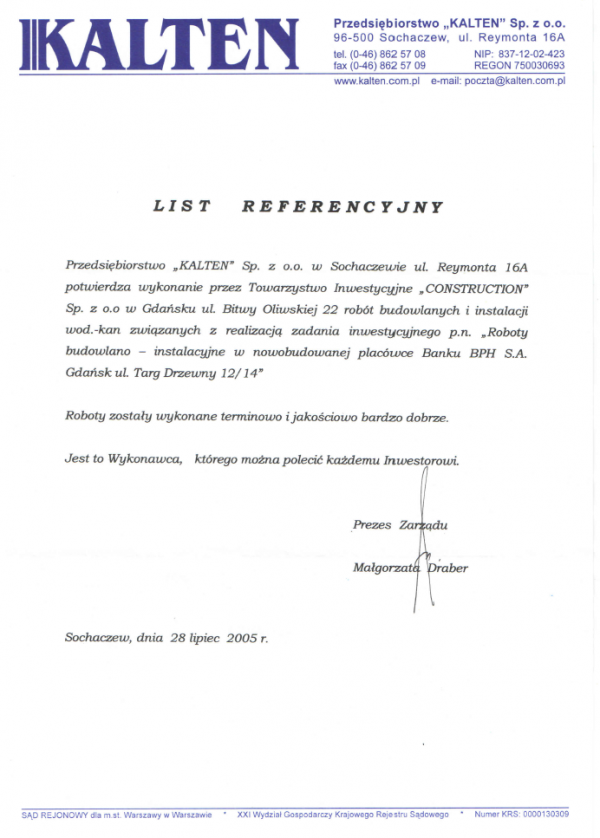 The company KALTEN Sp z o. o. in Sochaczew, ul. Reymonta 16A confirms that Towarzystwo Inwestycyjne "CONSTRUCTION" Sp z o. o. in Gdańsk at ul. Bitwy Oliwskiej 22 made construction works and water and sewagesystems related to the implementation of the investment project entitled "Construction and installation works in the newly built branch of Bank BPH S.A. Gdańsk, ul. Targ Rakowy 12/14 "