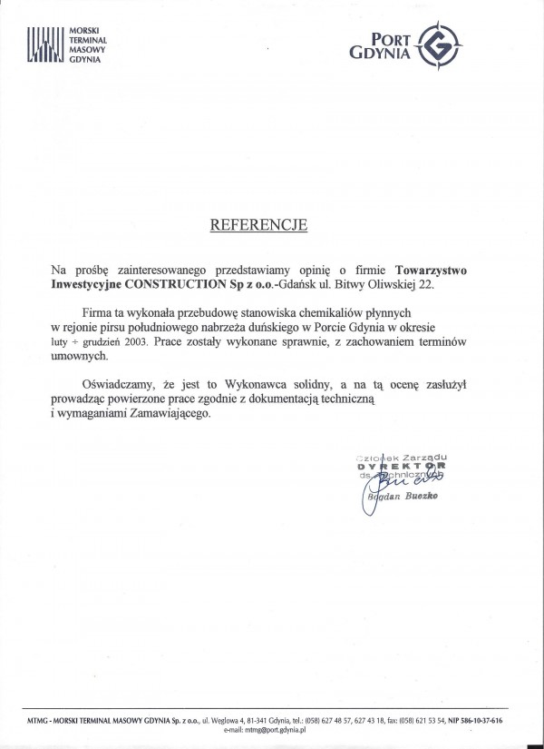 This company carried out the reconstruction of the liquid chemicals station in the area of the southern jetty of the Danish Quay at the Port of Gdynia in February-December 2003. The works were carried out efficiently, in accordance with contractual deadlines.