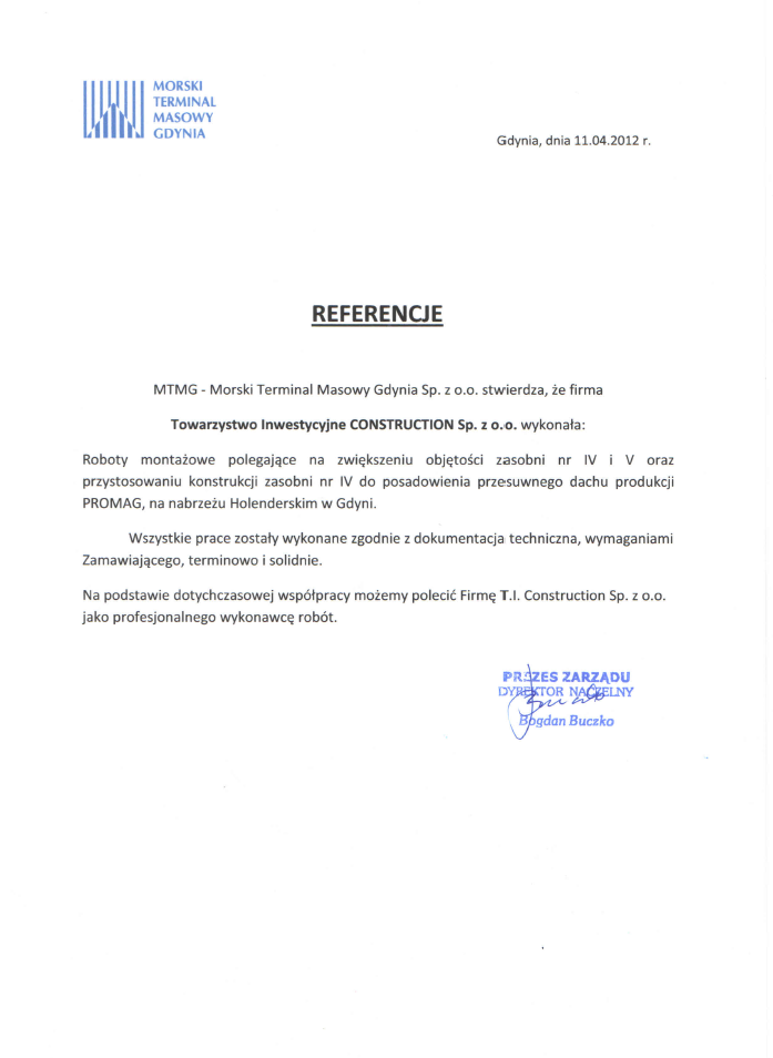 MTMG-Morski Terminal Masowy Gdynia Sp z o. o. certifies that the company