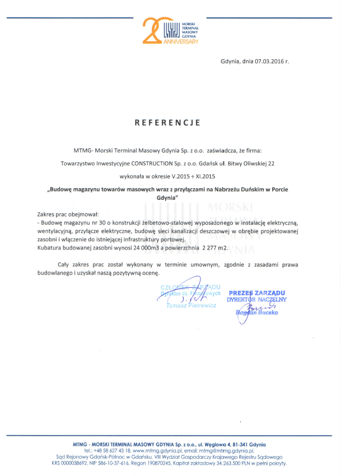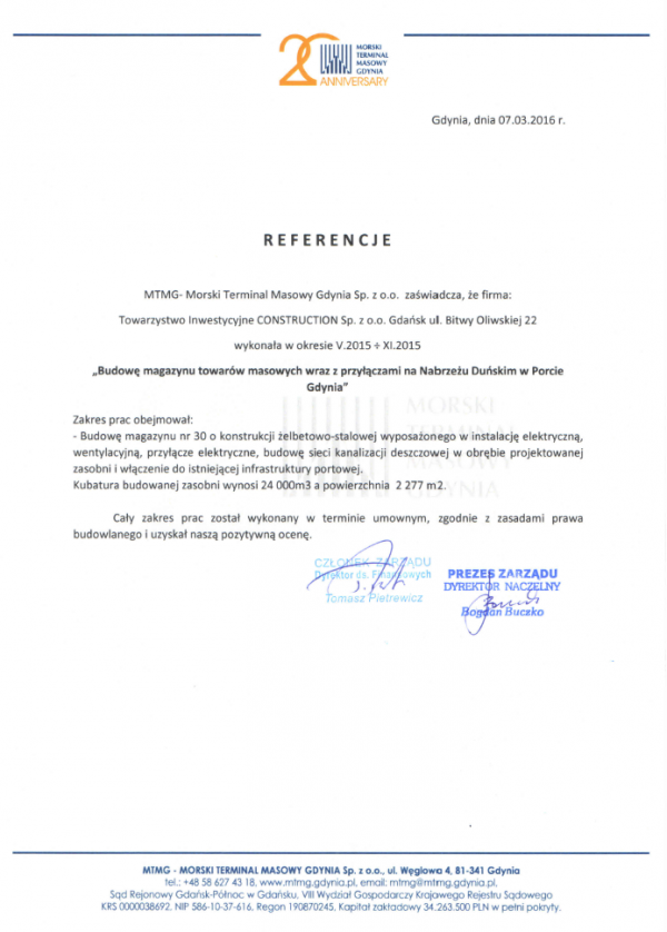 MTMG-Morski Terminal Masowy Gdynia Sp z o. o. certifies that the company