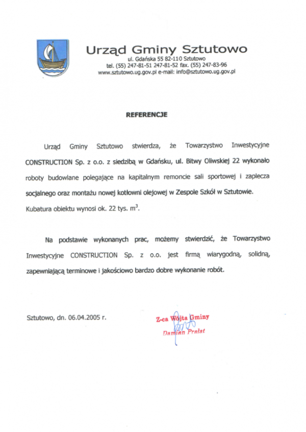 The Municipality Office of Sztutowo states that Towarzystwo Inwestycyjne CONSTRUCTION Sp z oo with its seat in Gdańsk, ul. Bitwy Oliwskiej 22 performed construction works consisting in a major renovation of the sports hall and social facilities as well as installation of a new oil boiler room in the School Complex in Sztutowo.
