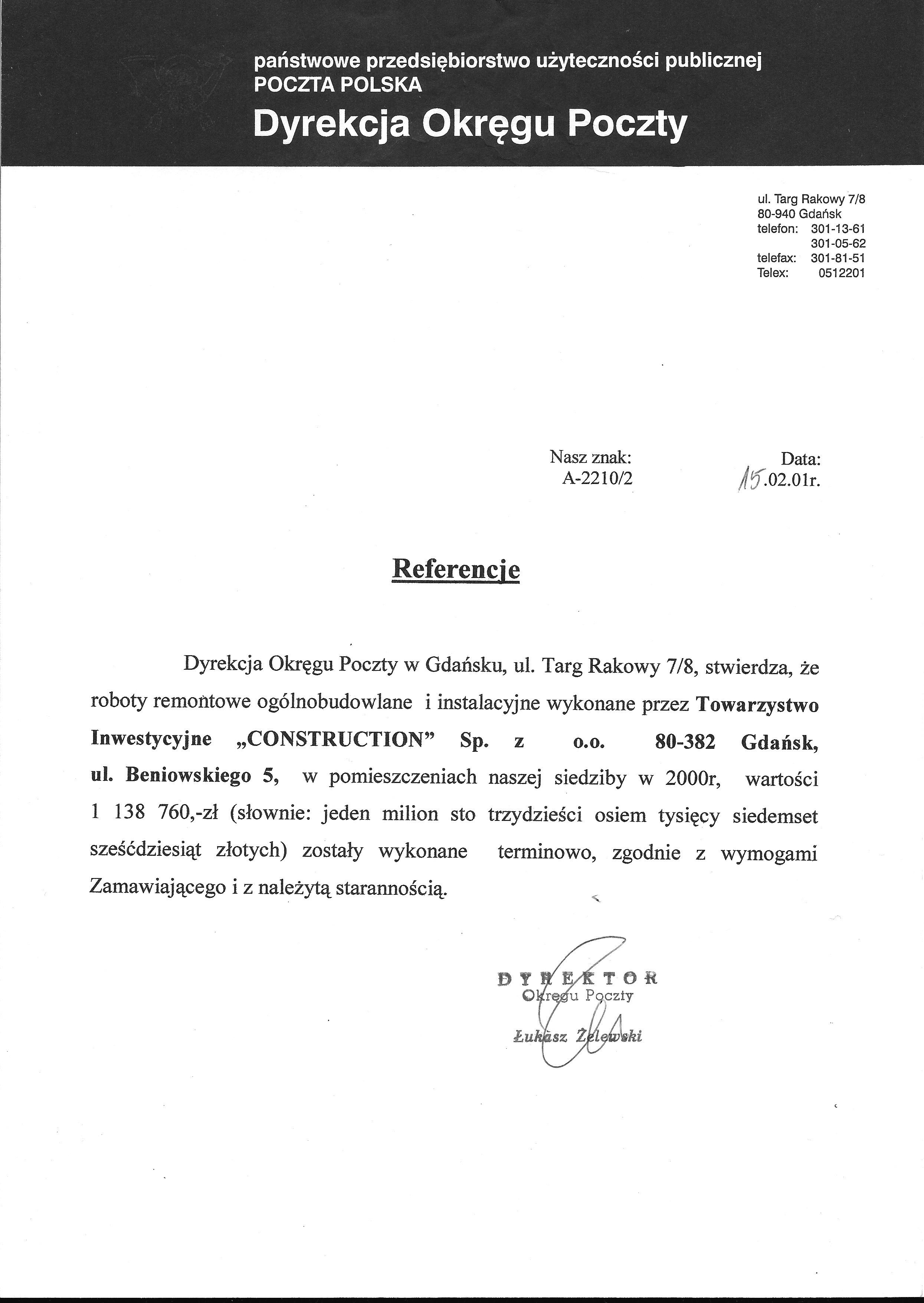 Management of the Post District in Gdańsk, ul. Targ Rakowy 7/8, states that general construction and installation renovation works performed by Towarzystwo Inwestycyjne "CONSTRUCTION" Sp. z o. o. 80-382 Gdańsk, ul. Beniowskiego 5, in the premises of our headquarters in 2000, the value of PLN 1 138 760 (in words: one million one hundred thirty eight thousand seven hundred and sixty zlotys) were made on time, in accordance with the requirements of the Ordering Party and with due diligence.