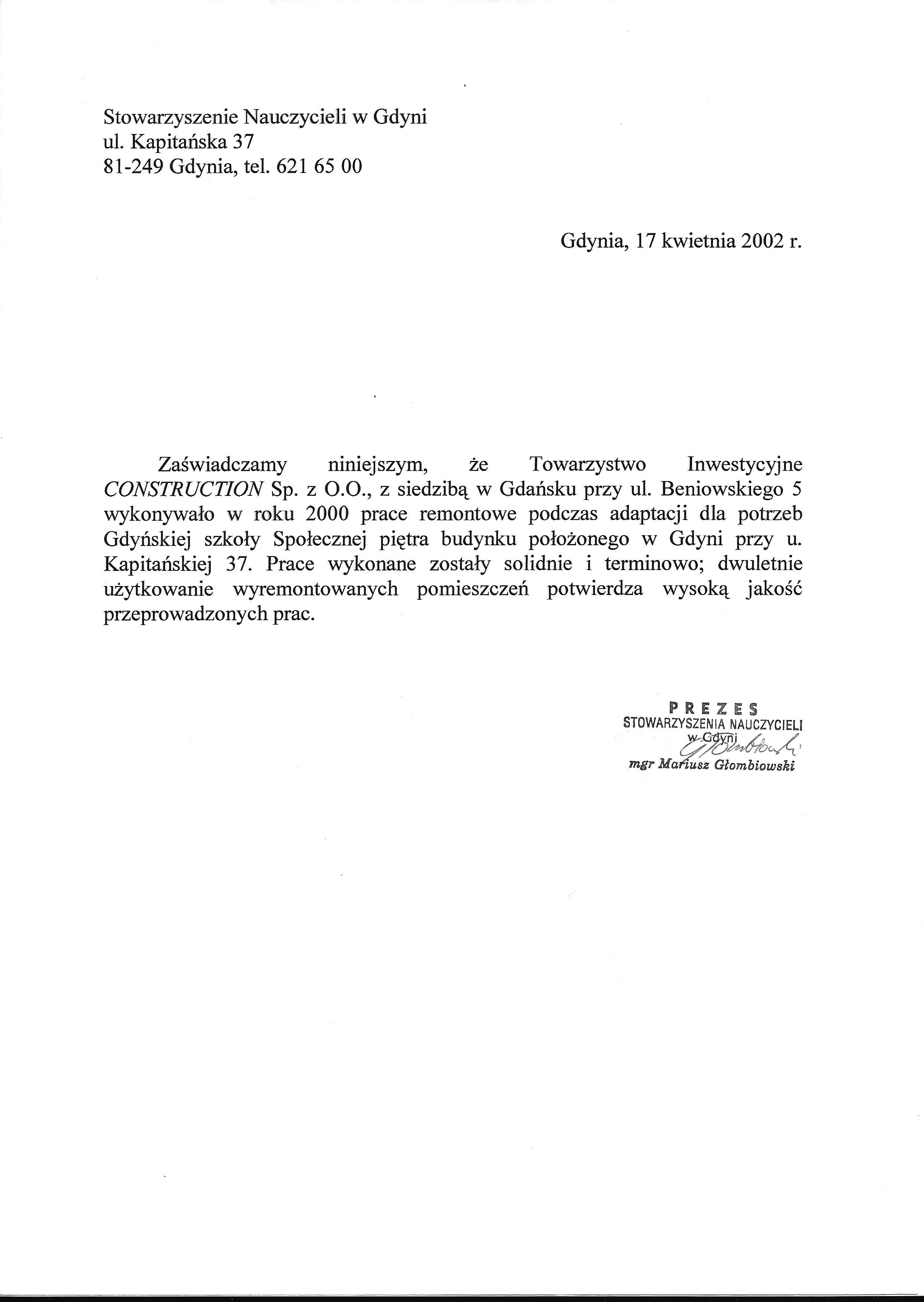 We hereby certify that Towarzystwo Inwestycyjne CONSTRUCTION Sp. z o. o., with its seat in Gdańsk at ul. Beniowskiego 5 performed renovation works in 2000 during the adaptation of the floor of the building located in Gdynia at ul. Kapitańska 37. The works were performed reliably and on time; two-year use of the renovated rooms confirms the high quality of the works carried out.