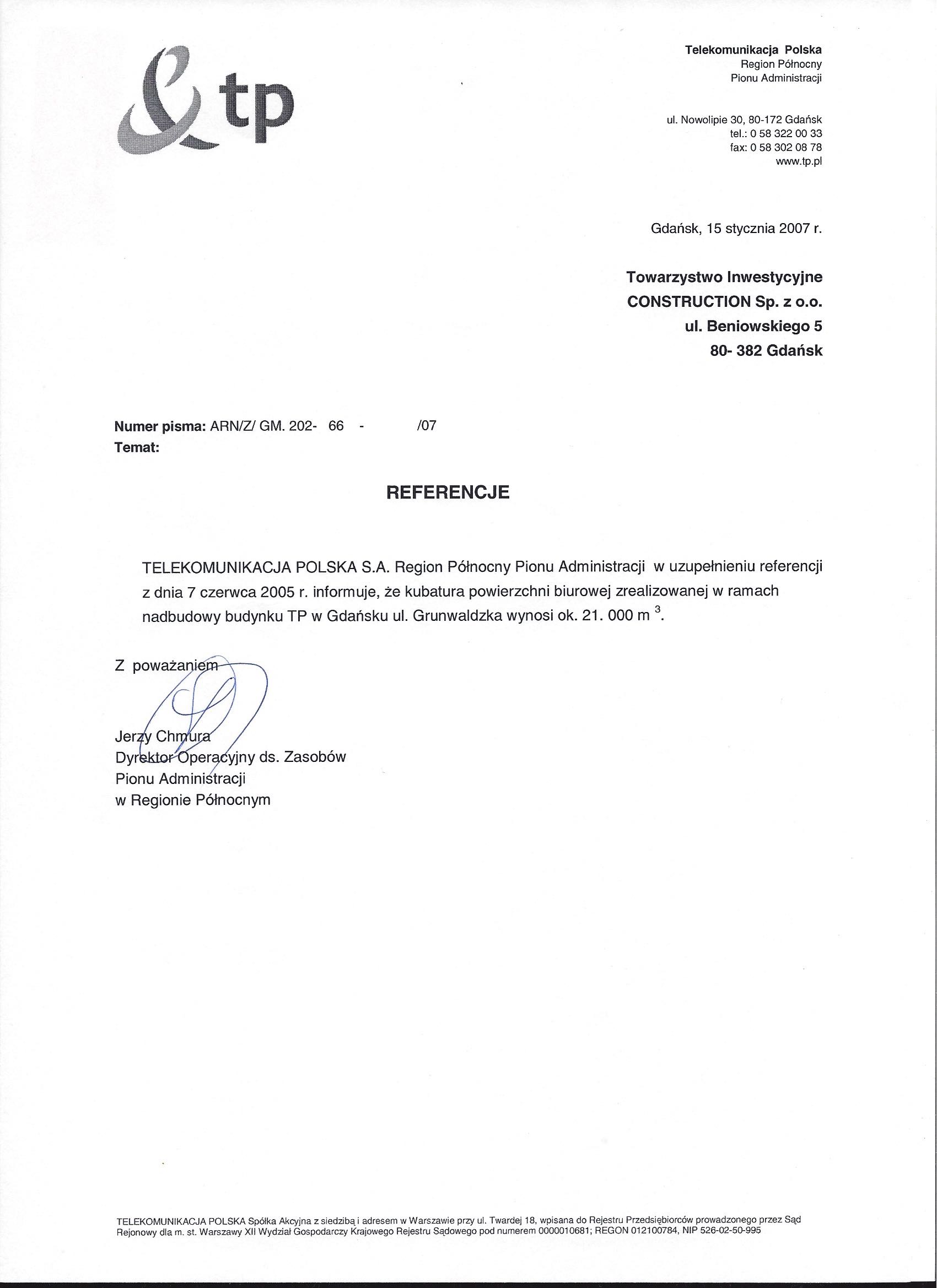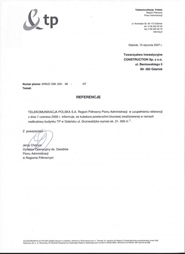 TELEKOMUNIKACJA POLSKA S.A. the Northern Region of the Administration Division, in addition to the references of 7th June 2005, informs that the volume of the office space constructed as part of the extension of the Telekomunikacja Polska building in Gdańsk at ul. Grunwaldzka is approx. 21,000 m3.