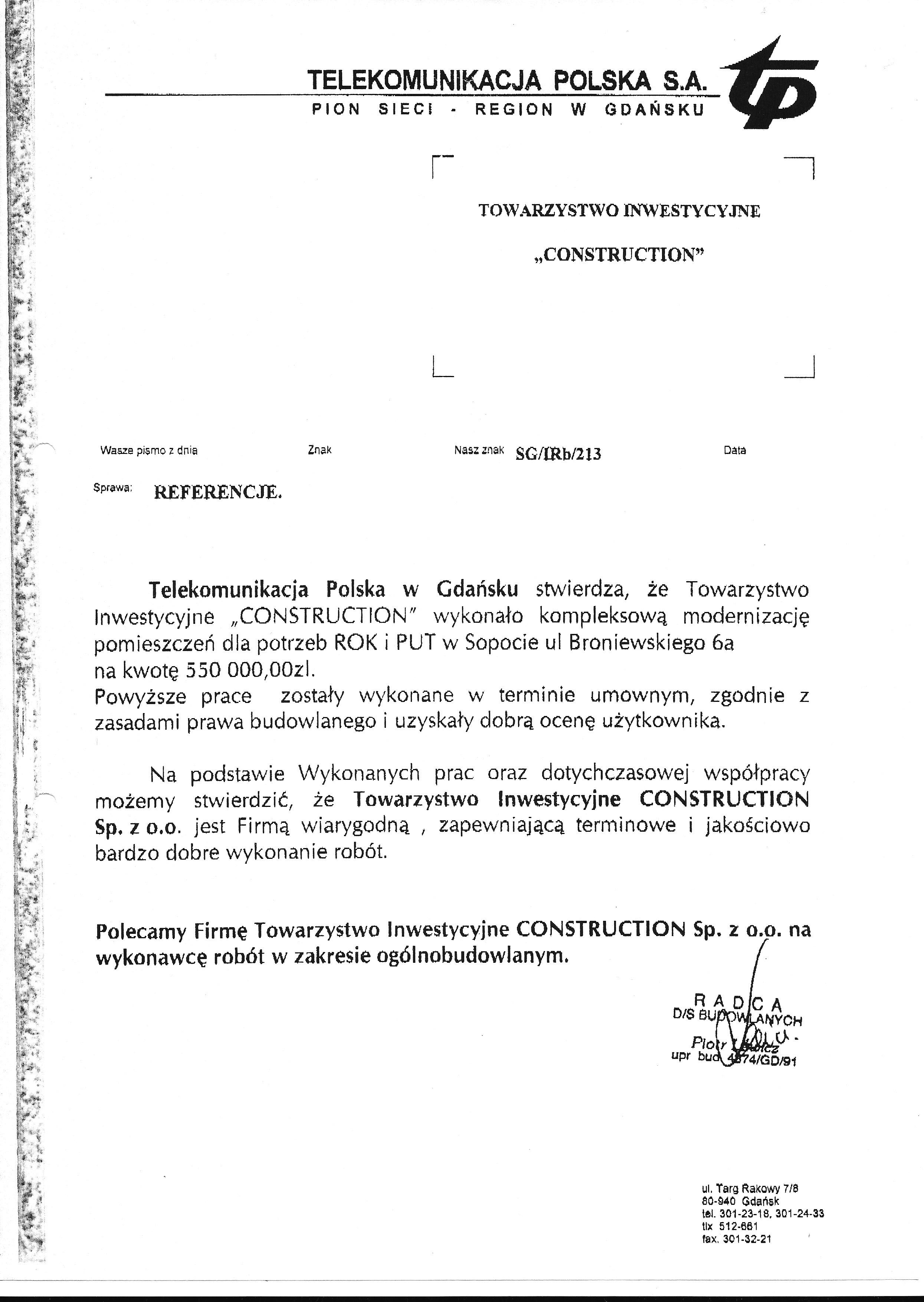 Telekomunikacja Polska in Gdańsk states that Towarzystwo Inwestycyjne "CONSTRUCTION" has completed a comprehensive modernization of rooms for the ROK and PUT in Sopot, ul. Broniewskiego 6a for the amount of PLN 550,000.00.