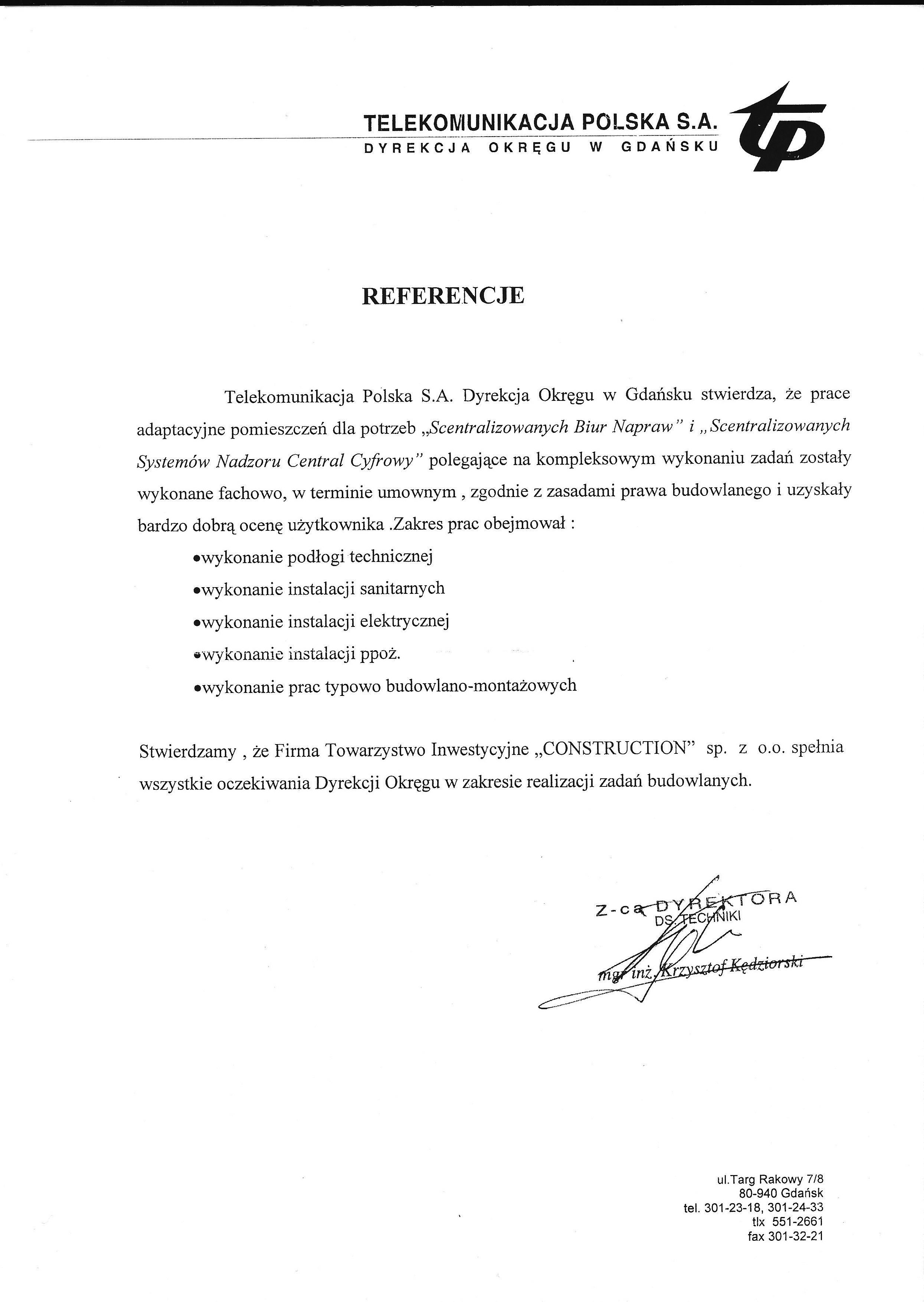 Telekomunikacja Polska S.A. District Management in Gdańsk states that the adaptation works of the premises for the needs of "Centralized Repair Offices" and "Centralized Supervision Systems of Digital Centres" consisting in the comprehensive performance of tasks were performed professionally, within the contractual deadline, in accordance with the principles of construction law and obtained a very good user's assessment. The scope of works included: