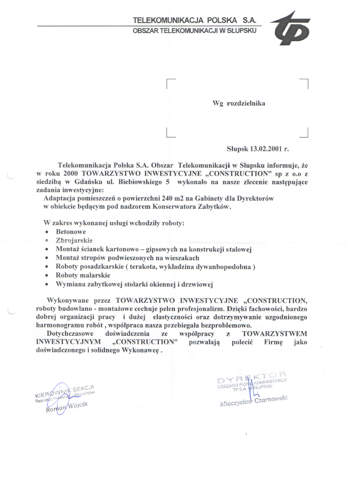 Telekomunikacja Polska S.A. Obszar Telekomunikacji w Słupsku informuje, że w roku 2000 TOWARZYSTWO INWESTYCYJNE CONSTRUCTION SP Z O.O. z siedzibą w Gdańsku ul. Beniowskiego 5 wykonało na nasze zlecenie następujące zadania inwestycyjne: