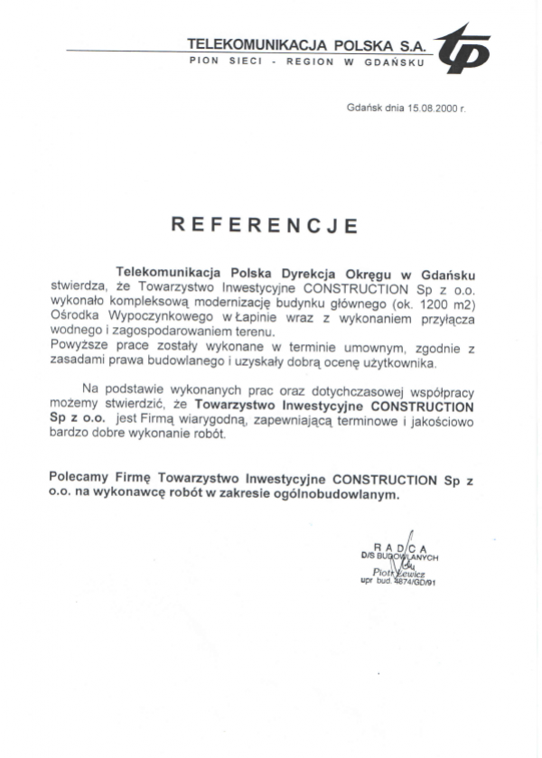 Telekomunikacja Polska District Management in Gdańsk states that Towarzystwo Inwestycyjne CONSTRUCTION Sp. z o. o. carried out a comprehensive modernization of the main building (approx. 1,200 m²) of the Recreation Centre in Łapina along with the construction of a water connection and land development.