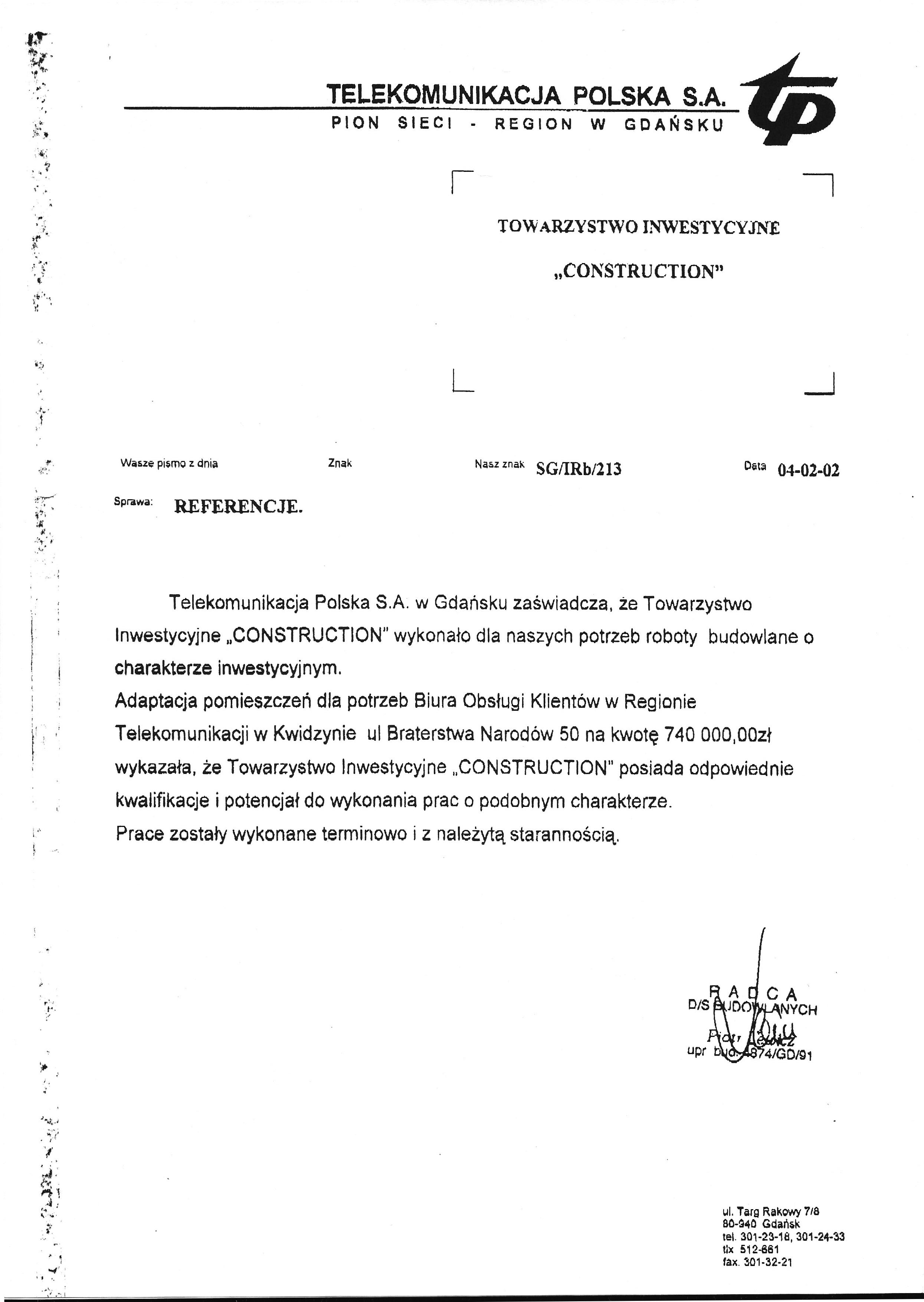 Telekomunikacja Polska S.A. in Gdańsk certifies that Towarzystwo Inwestycyjne "CONSTRUCTION" carried out investment construction works for our needs.
