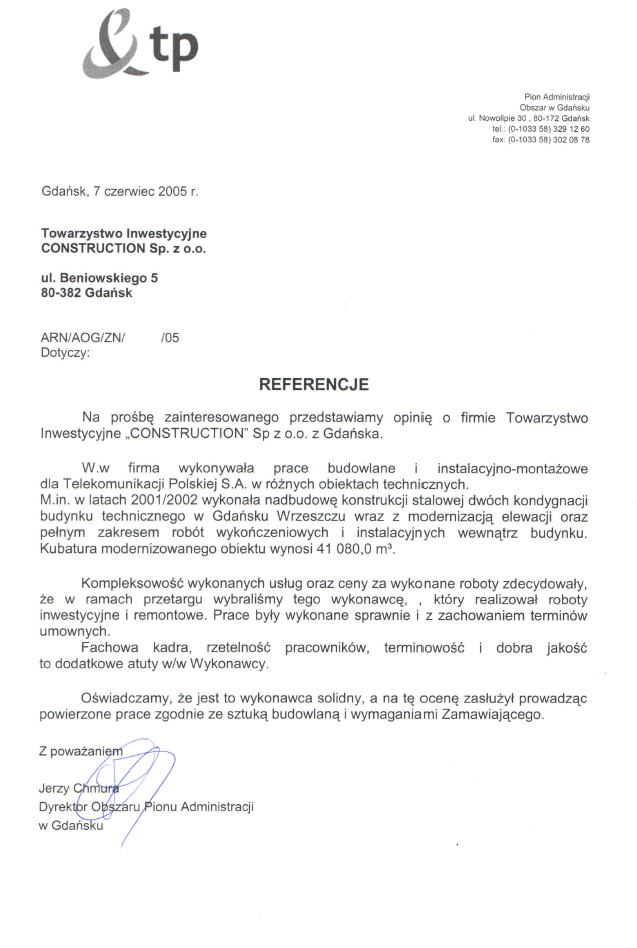 A.i. in the years 2001/2002, it made a steel structure superstructure of two storeys of a technical building in Gdańsk Wrzeszcz, along with the modernization of the facade and a full scope of finishing and installation works inside the building.