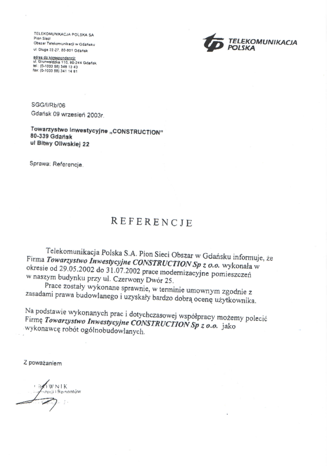 Telekomunikacja Polska Network Division Area in Gdańsk informs that Towarzystwo Inwestycyjne CONSTRUCTION Sp. z o. o. in the period from 29.05. 2002 to 31.07.2002, modernization works were carried out in rooms in our building at ul. Czrwony Dwór 25.