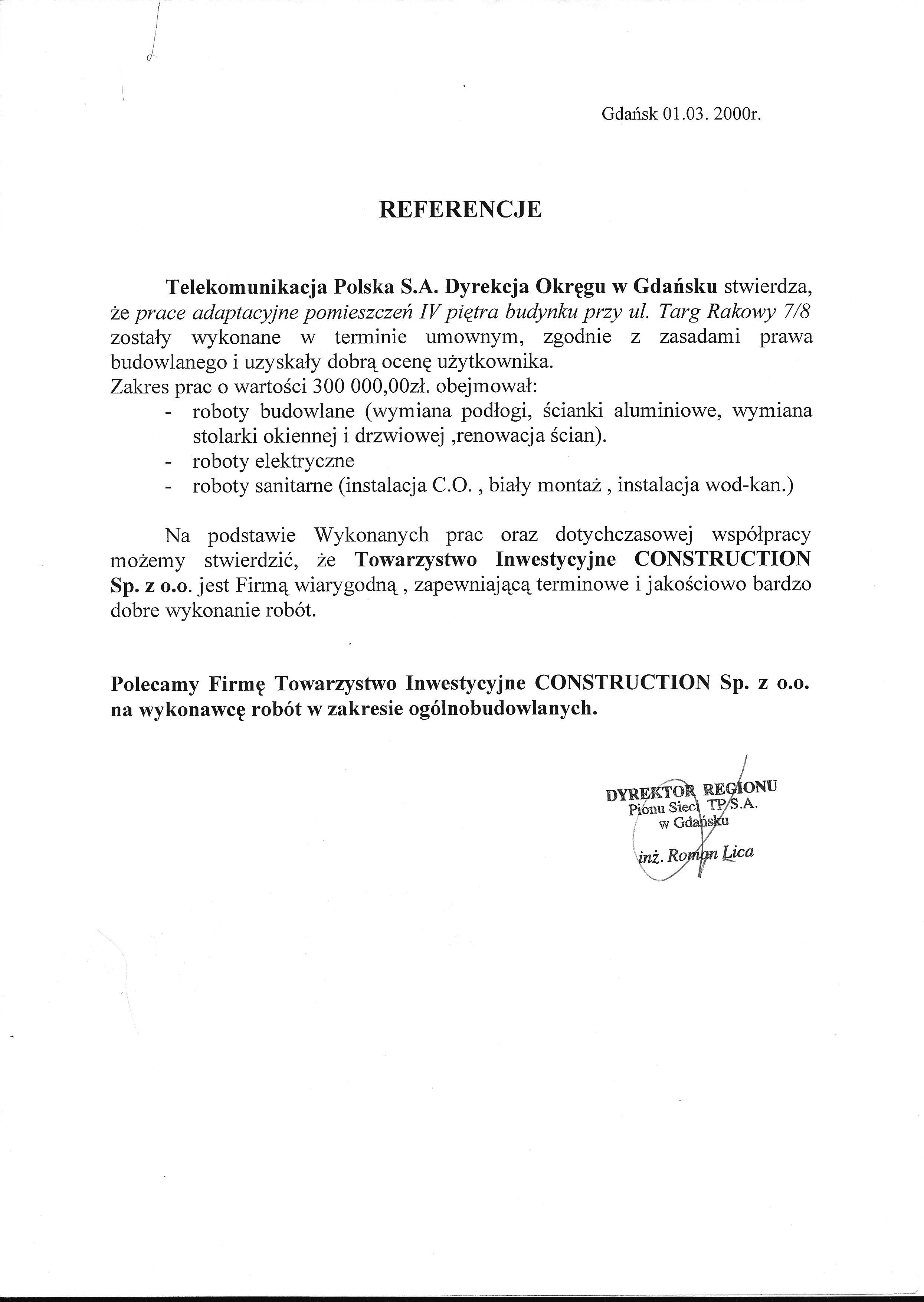 Telekomunikacja Polska S.A. District Management in Gdańsk states that the adaptation works of the rooms on the 4th floor of the building at ul. Targ Rakowy 7/8 were completed within the contractual deadline, in accordance with the principles of construction law, and received a good user's assessment.