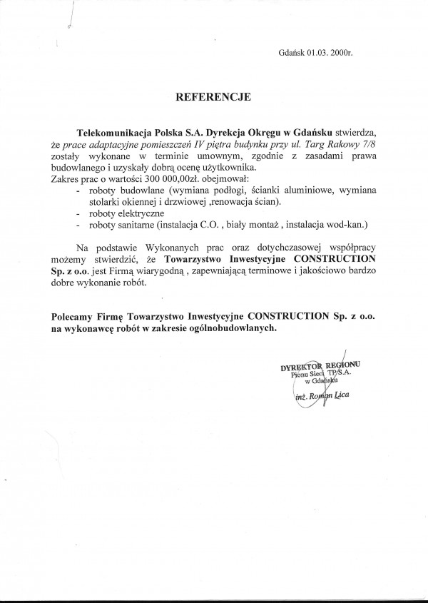 Based on the works performed and the cooperation so far, we can state that Towarzystwo Inwestycyjne CONSTRUCTION Sp z o. o. is a reliable company, ensuring timely and qualitatively very good execution of works.