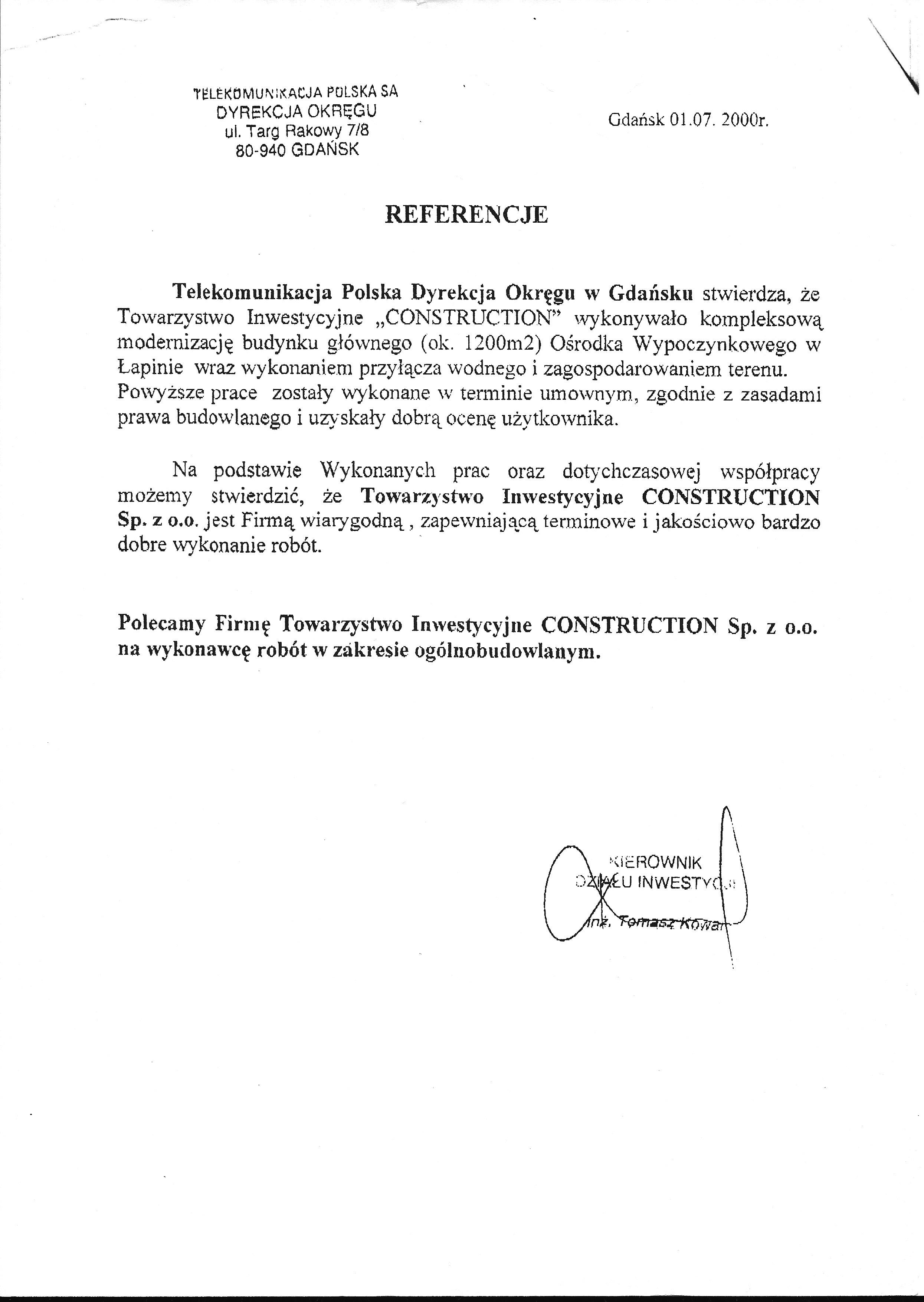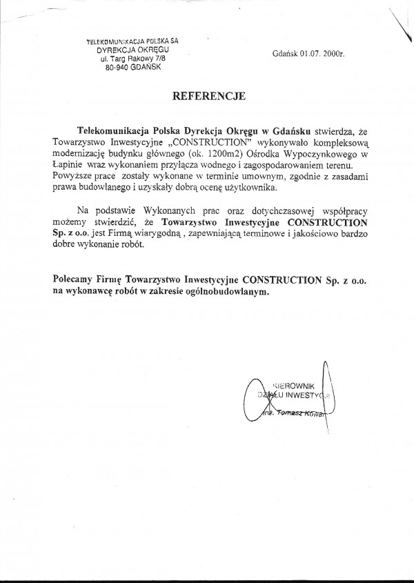 Telekomunikacja Polska District Management in Gdańsk states that Towarzystwo Inwestycyjne CONSTRUCTION Sp. z o. o. carried out a comprehensive modernization of the main building (approx. 1,200 m²) of the Recreation Centre in Łapina along with the construction of a water connection and land development. The above-mentioned works were performed within the contractual period, in accordance with the principles of construction law, and received a good user's assessment.